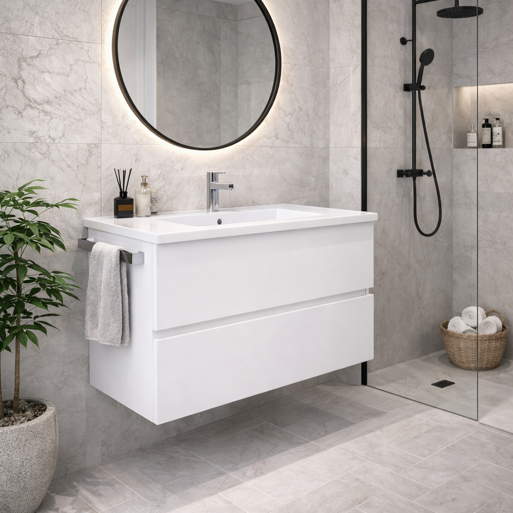 La Colección Valencia combina estilo contemporáneo, practicidad y acabados premium para transformar tu baño en un espacio moderno y funcional. Su diseño suspendido, con líneas limpias y cajones de gran capacidad con cierre amortiguado, aporta comodidad y sofisticación en el día a día.
